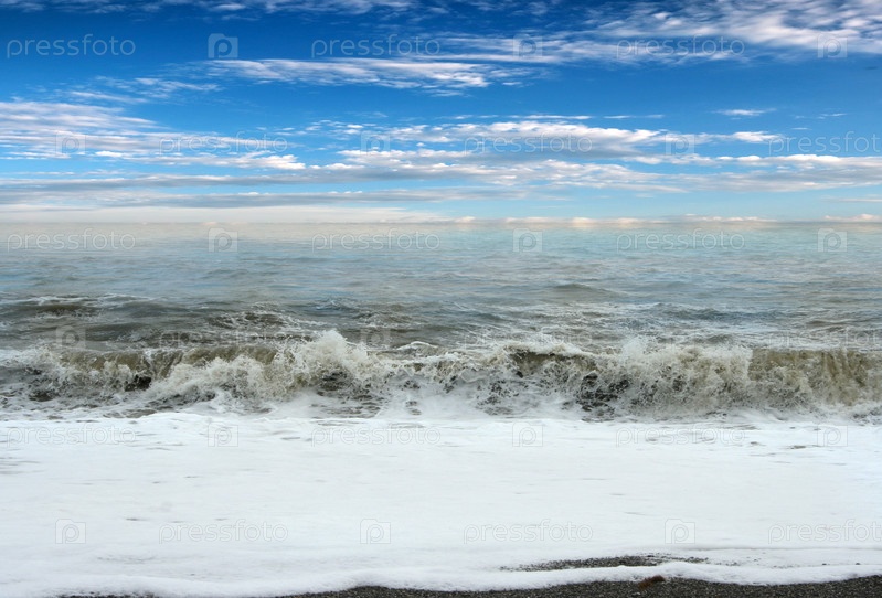Штормовые волны и галечный пляж на берегу моря