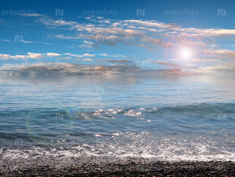Пятно солнечного света на облачном небе и волны, падающие на морской пляж