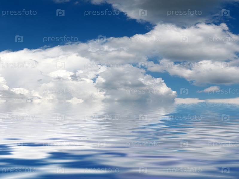 Облака в небе, ярко освещенные солнцем и спокойная гладь океана