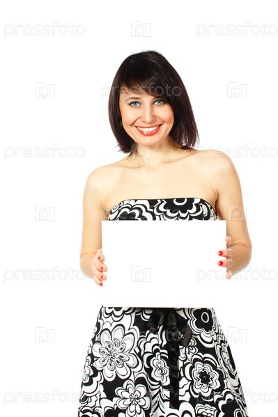 Веселая девушка держит пустой баннер