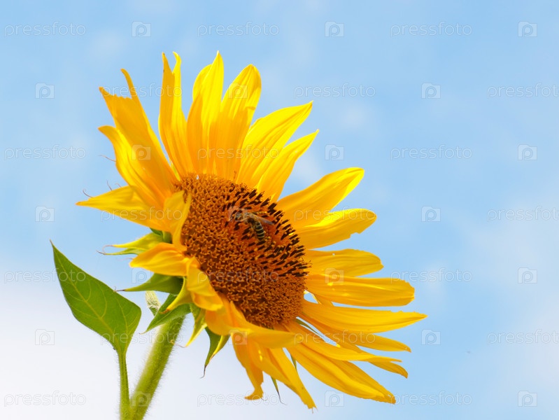 Свежий красивый цветок подсолнуха на фоне солнечного неба