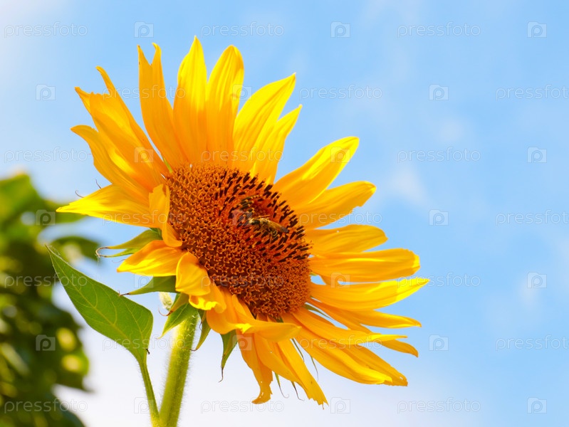Свежий красивый цветок подсолнуха на фоне солнечного неба