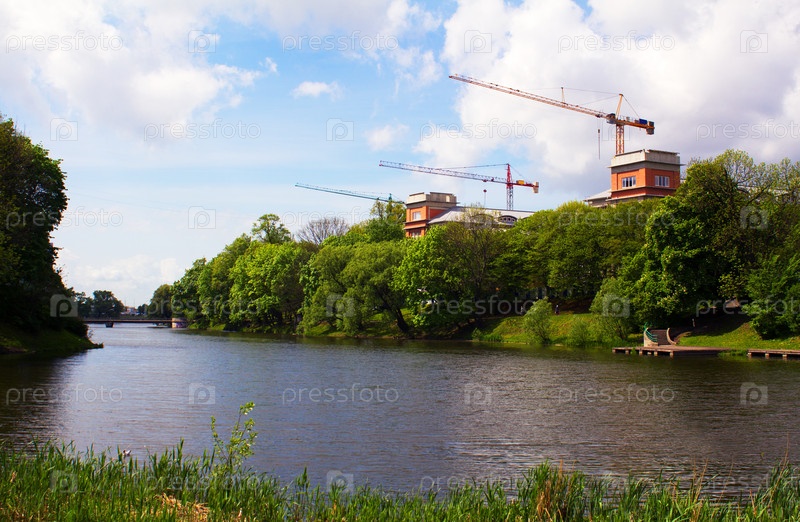 Индустриальный пейзаж с тремя журавлями у озера