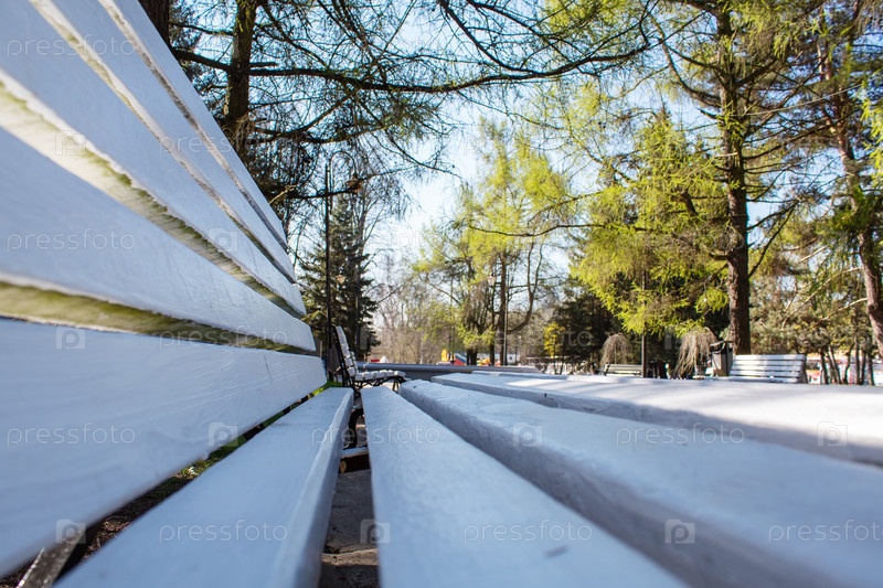 Скамейки на аллее в парке ранним утром