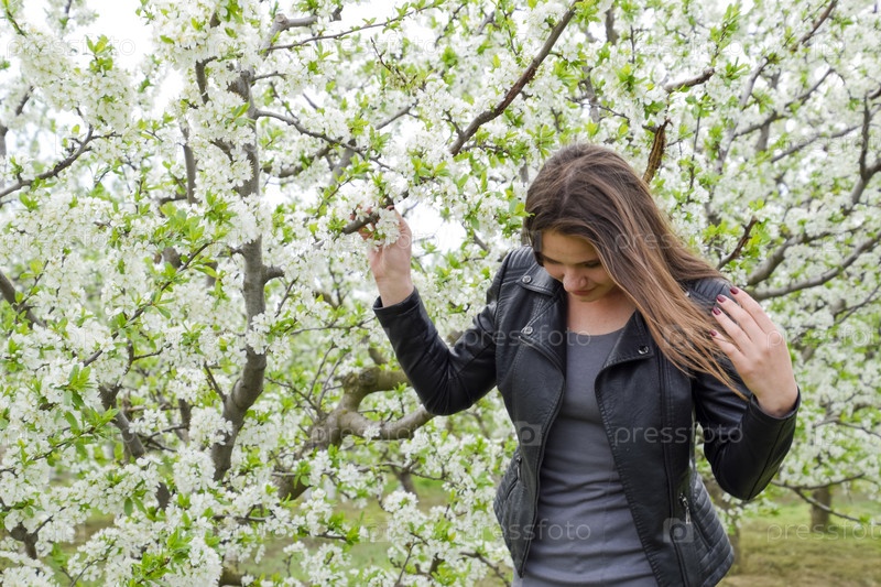 Красивая фея молодая девушка в цветущем сливовом саду. Портрет