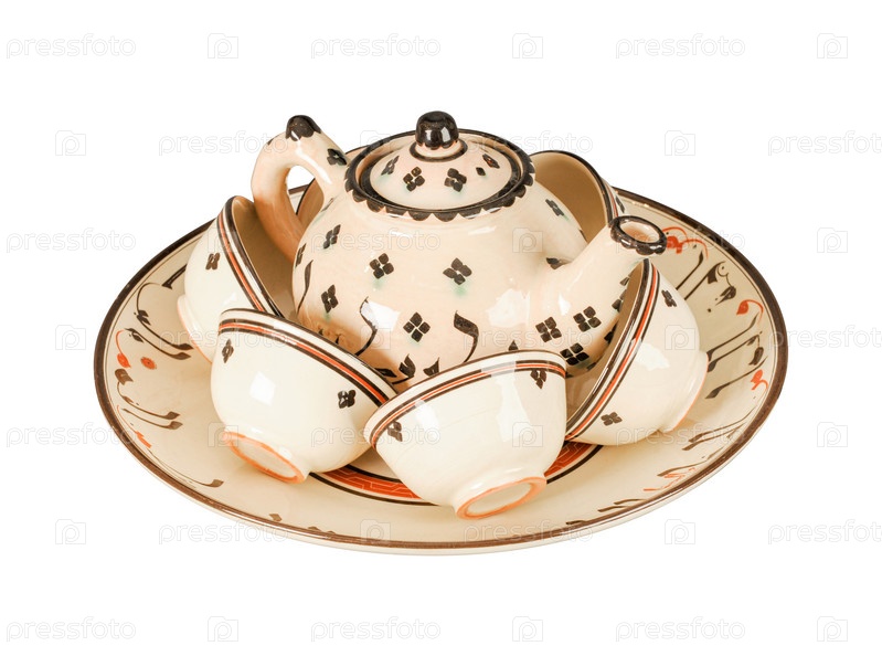 Винтажный восточный керамический чайник и чашки на белом фоне
