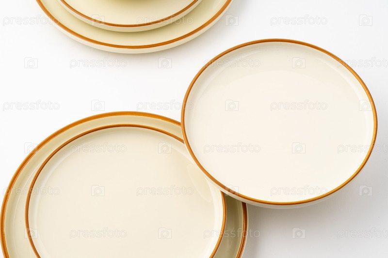 Набор белой и коричневой керамической тарелки и миски на белом фоне