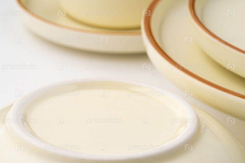 Набор белой и коричневой керамической тарелки и миски на белом фоне