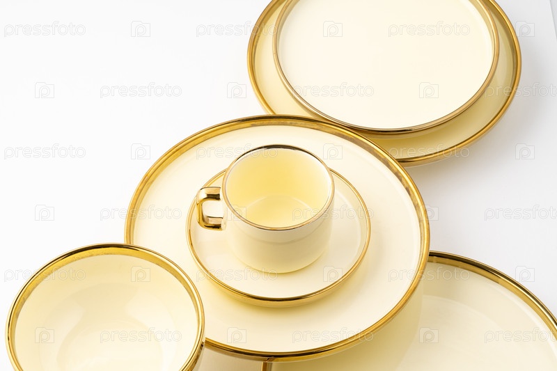 Набор золотой роскошной керамической кухонной утвари на белом фоне