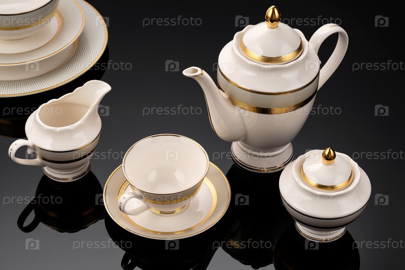 Роскошная посуда на черной отражающей поверхности