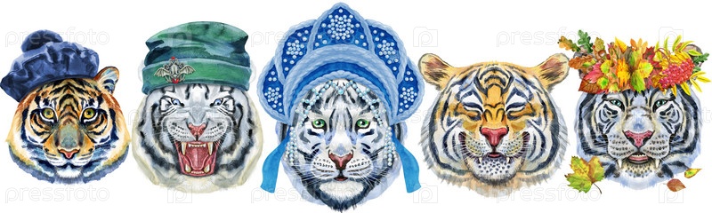 Граница тигра с различными аксессуарами. Акварельная иллюстрация диких животных на белом фоне