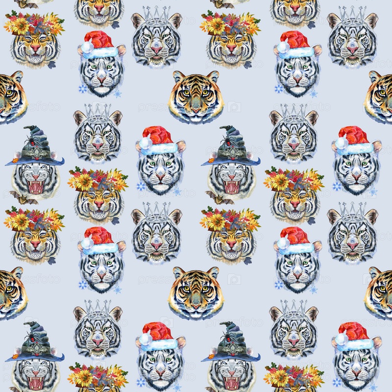 Акварель бесшовный узор с милыми тиграми на белом фоне. Модный дизайн ткани