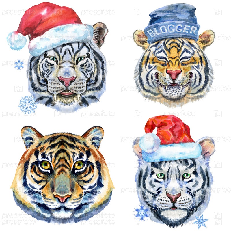 Акварельная иллюстрация тигров в шляпе Санты и шляпе блогера