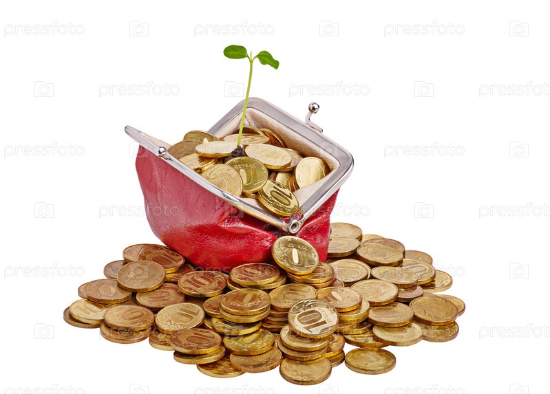 Старый красный кошелек с золотыми монетами и нежный зеленый росток. Изолированные на белом фоне