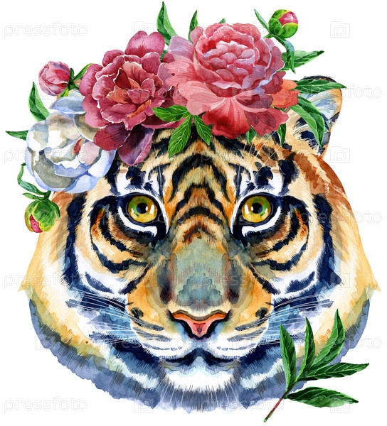 Персонаж гороскопа головы тигра с цветами на белом фоне