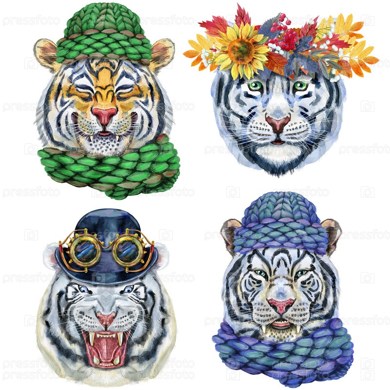 Акварельная иллюстрация тигров в вязаной зимней шапке, котелке с очками и венке из осенних листьев