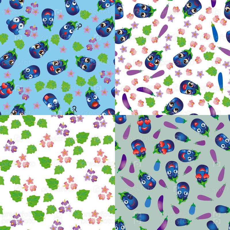 Набор бесшовных овощных баклажанов. Смешные милые лица персонажей