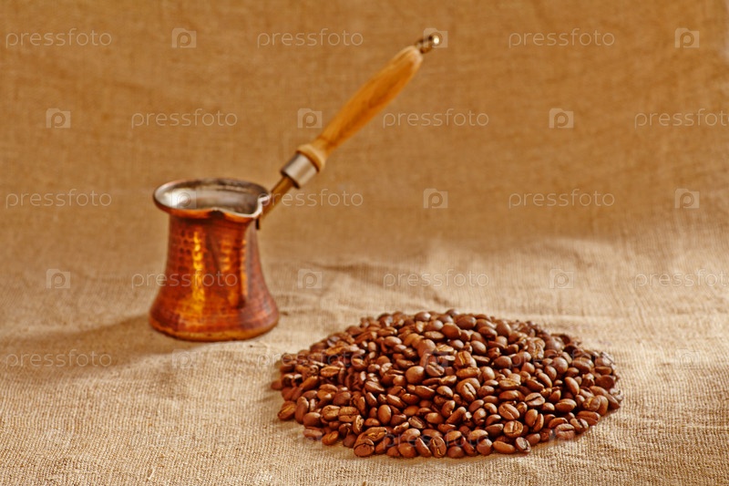 Старый медный кофейник и кофейные зерна на холсте. Выборочный фокус