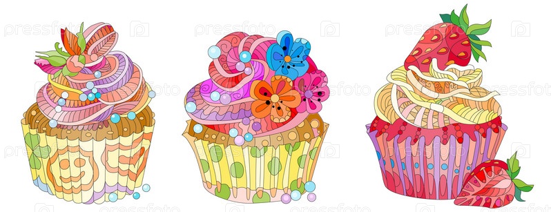 Векторный набор кексов с клубникой, цветами и абстрактными орнаментами