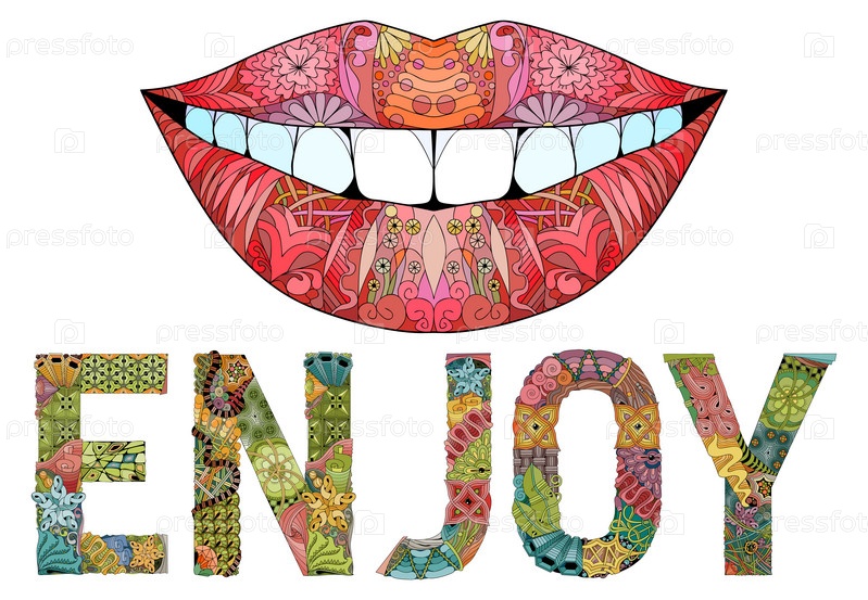 Слово ENJOY с силуэтом губ. векторный декоративный объект zentangle