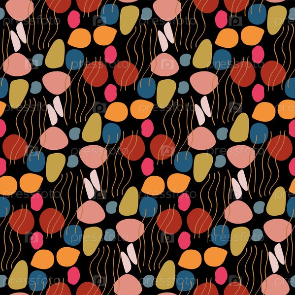 Абстрактные модные бесшовные узоры с нарисованными вручную красочными формами на черном фоне