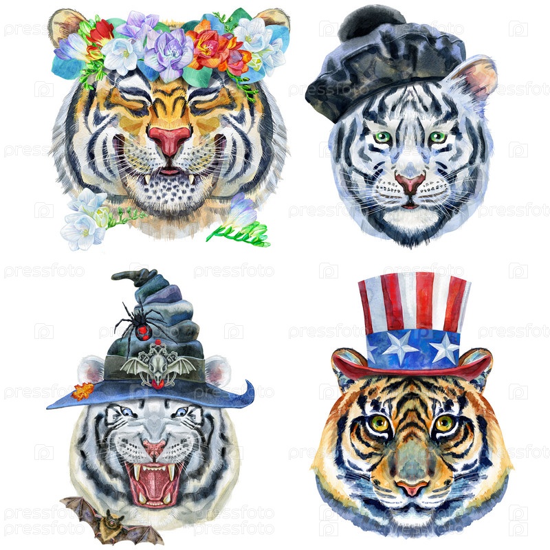 Акварельная иллюстрация тигров в венке из фрезии, берете, шляпе ведьмы и шляпе дяди Сэма