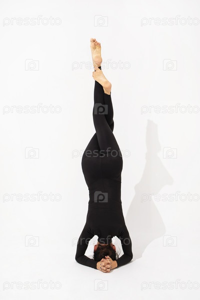 Женщина в спортивной одежде выполняет вариант упражнения ширшасана, стойка на локтях со скрещенными ногами на белом фоне