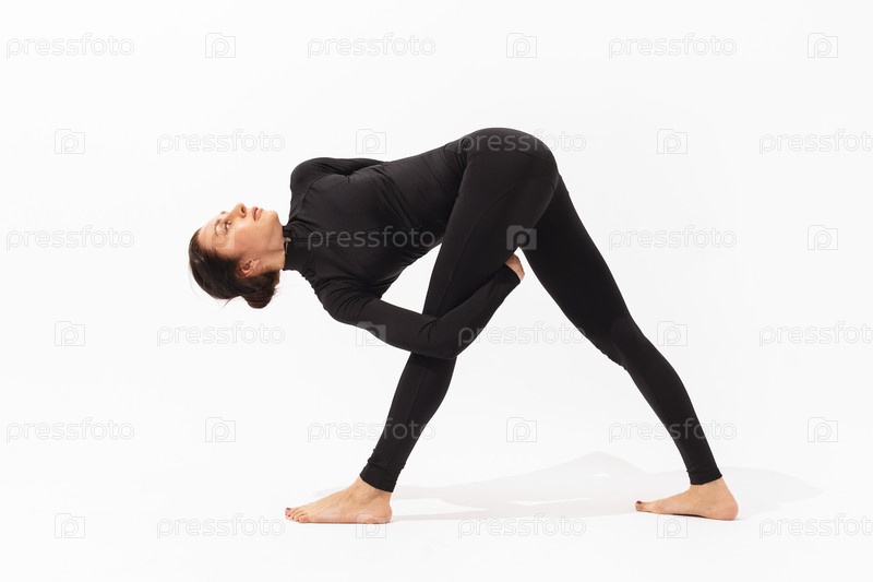 Женщина в черной спортивной одежде, практикующая йогу, выполняет упражнение Триканасана, поза треугольника с захватом бедра на белом фоне