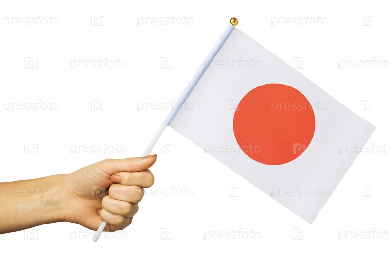 Женская рука держит флаг Японии на белом фоне, шаблон для дизайнеров