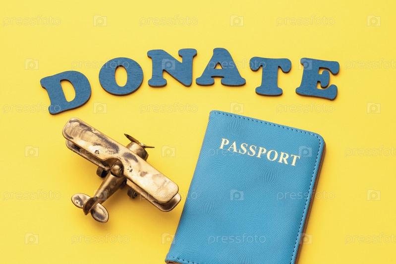 Слово из деревянных букв, игрушечный самолет и паспорт на желтом фоне, концепция на тему пожертвования на билет