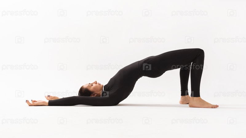 Женщина в спортивной одежде практикует йогу, выполняя вариацию упражнения дви пада питасана на белом фоне