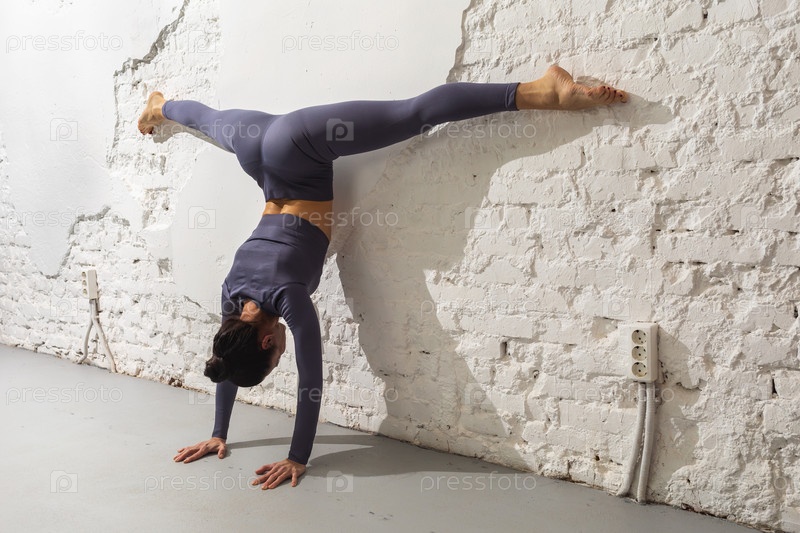 Женщина-практикующая йогу выполняет упражнение Адхо Мукха Врикшасана с Самаконасаной, стойкой на двух руках с перекрестным шпагатом возле кирпичной стены
