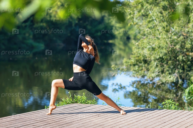 Женщина в спортивной черной одежде, практикующая йогу, выполняет вариацию упражнения вирабхадрасана, позу воина, тренируется теплым летним утром, стоя на деревянном мосту у реки