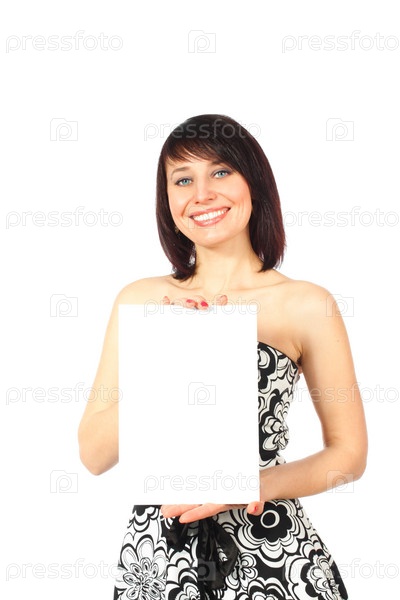 Веселая женщина с чистым белым листом