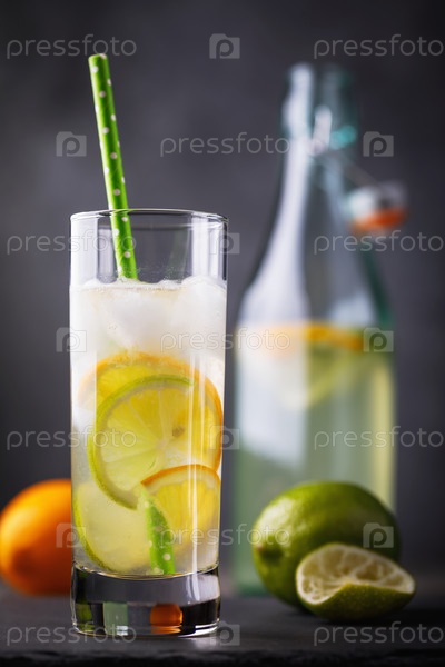 Стакан воды с лимоном и лаймом на столе, крупный план