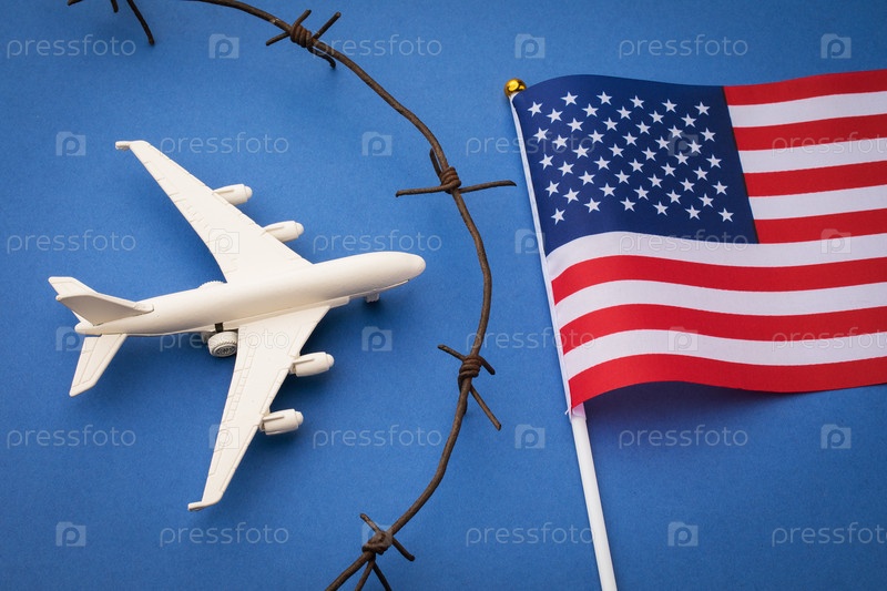 Концепция закрытого воздушного пространства США, игрушечный самолет, колючая проволока и флаг на синем фоне