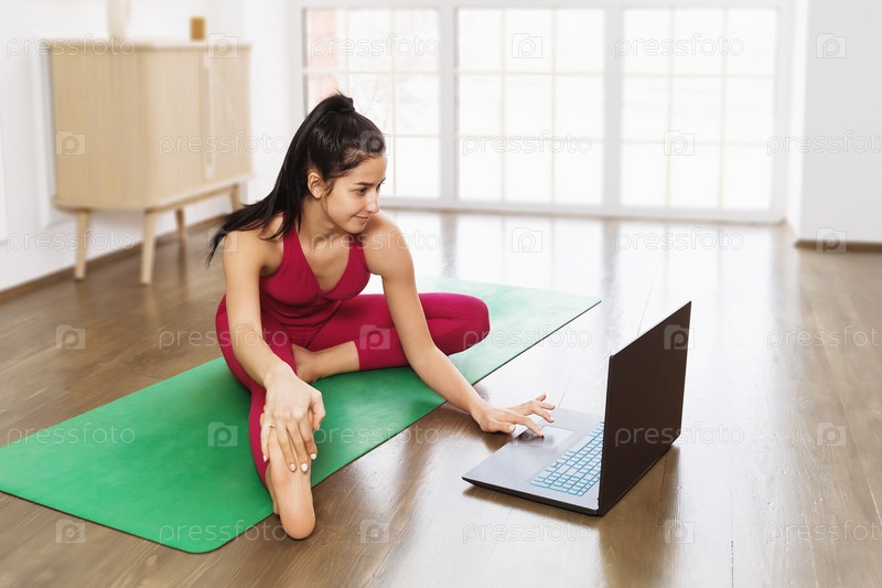 Молодая привлекательная женщина в розовом спортивном костюме сидит дома на зеленом гимнастическом коврике и смотрит онлайн-упражнения на ноутбуке. Концепция онлайн-обучения