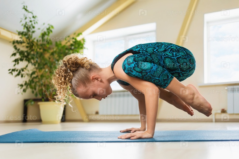 Маленькая красивая девушка со светлыми волосами, практикующая йогу, занимающаяся стойкой на руках, какасана или поза вороны на гимнастическом коврике в студии
