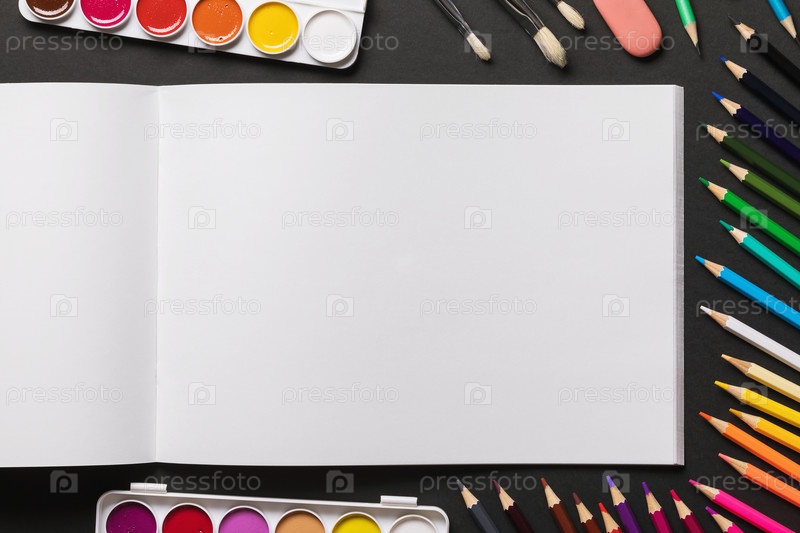 Откройте пустой альбом для рисования, акварельных красок, кистей и цветных карандашей на темном фоне с копией пространства