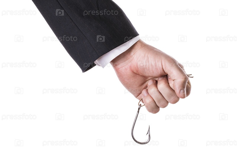 Мужчина в костюме крепко держит в руке рыболовный крючок, изолированный на белом фоне. Концепция на крючке