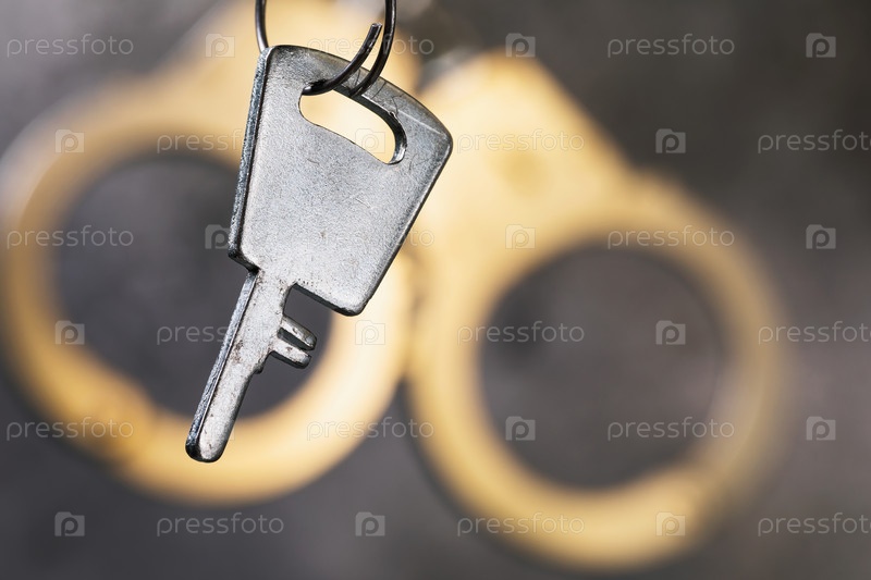 Ключ и наручники, крупный план. Понятие о ключе к свободе