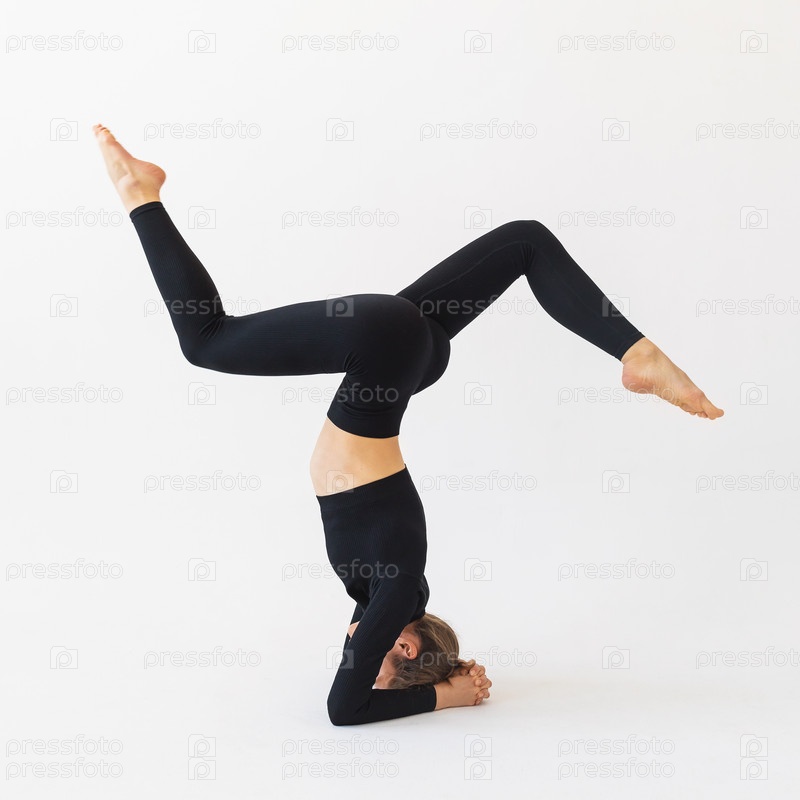 Молодая женщина в черной спортивной одежде выполняет вариант упражнения ширшасана, тренируется в студии на светлом фоне