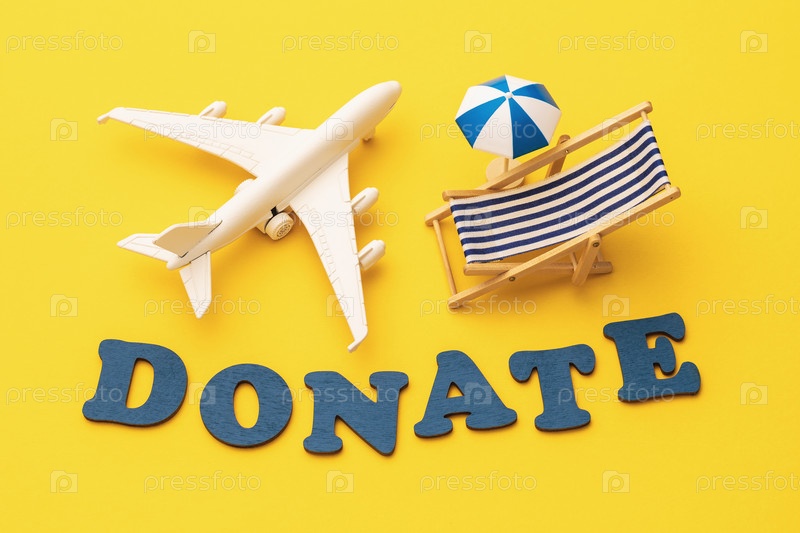 Слово из деревянных букв, игрушечный самолет, пляжный зонт и шезлонг на желтом фоне, концепция пожертвования на отпуск