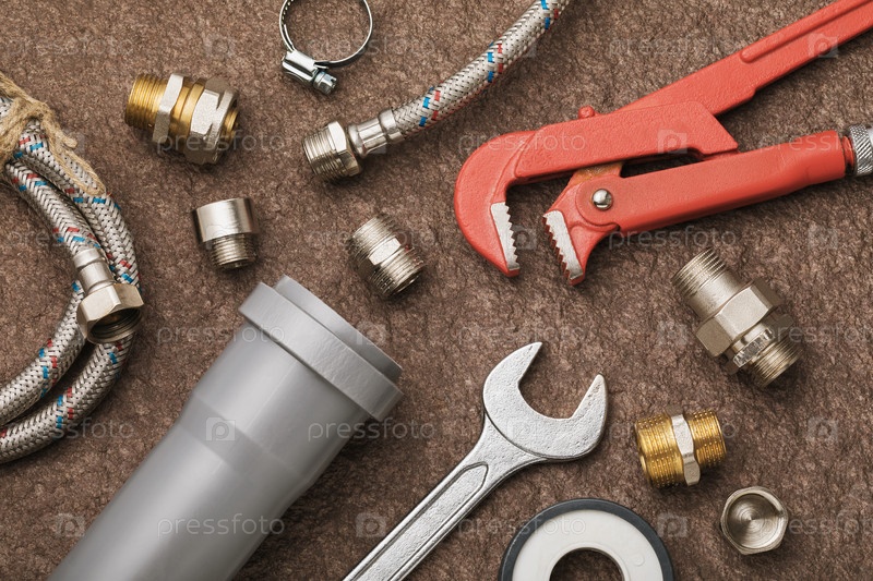 Различные сантехнические инструменты для подключения кранов и канализации, вид сверху