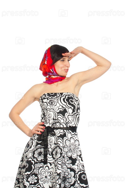 Женщина демонстрирует платье и платок