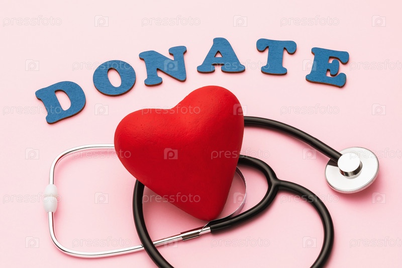 Слово из деревянных букв, игрушечное сердце и медицинский стетоскоп на розовом фоне, концепция на тему донорства для лечения