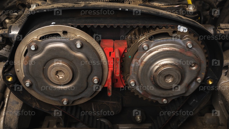 Установлен новый ремень ГРМ и заблокированные распределительные валы легкового автомобиля, крупный план
