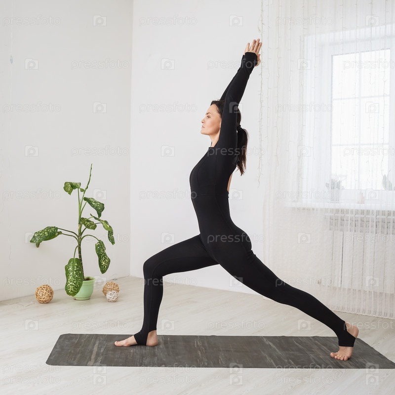 Женщина, практикующая йогу, выполняет упражнение вирабхадрасана, поза воина, тренируется, стоя на коврике