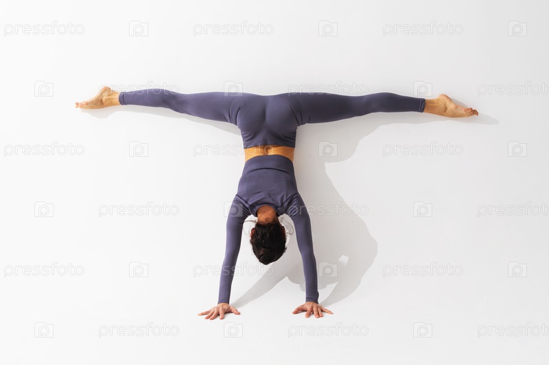 Женщина, практикующая йогу, выполняет упражнение Адхо Мукха Врикшасана с Самаконасаной, стоит на руках с поперечной бечевкой на белом фоне