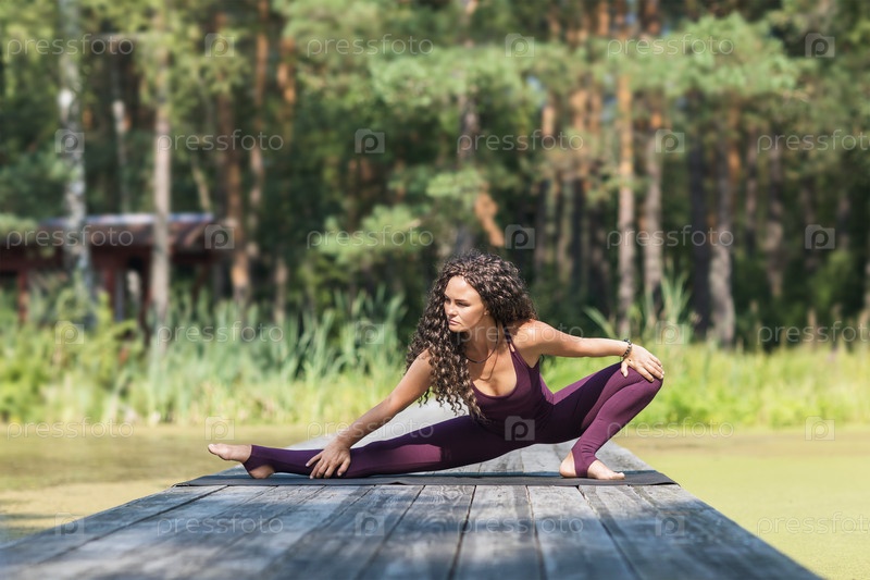Женщина в спортивной одежде, занимающаяся йогой в парке, выполняет боковой выпад